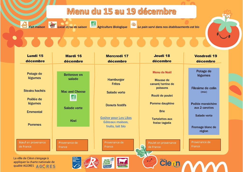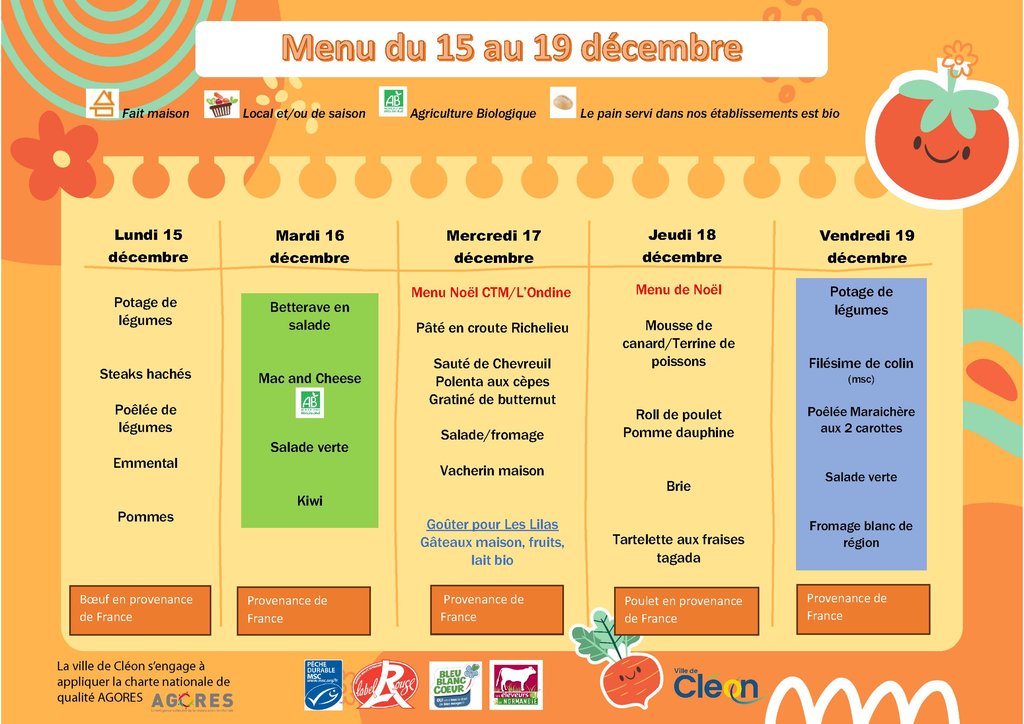 đ„ Retrouvez dĂšs Ă prĂ©sent le menu de la cantine scolaire, prĂ©parĂ© par les cuisiniers de lâUnitĂ© Centrale de Production des Repas (UCPR) de la Ville de ClĂ©on, pour la semaine du 15 au 19 dĂ©cembre. Vous trouverez un menu pour les Ă©coles et un menu pour LâOndine.