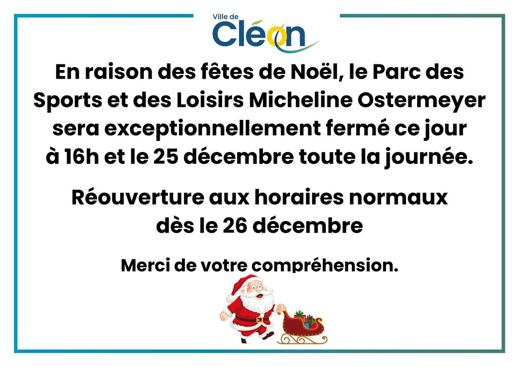 đ En raison des fĂȘtes de NoĂ«l, le Parc des Sports et des Loisirs sera temporairement fermĂ© dĂšs aujourd'hui Ă partir de 16h et demain, jeudi 25 dĂ©cembre, toute la journĂ©e.