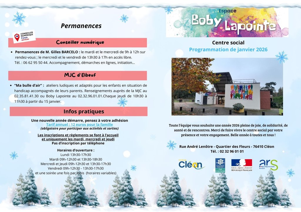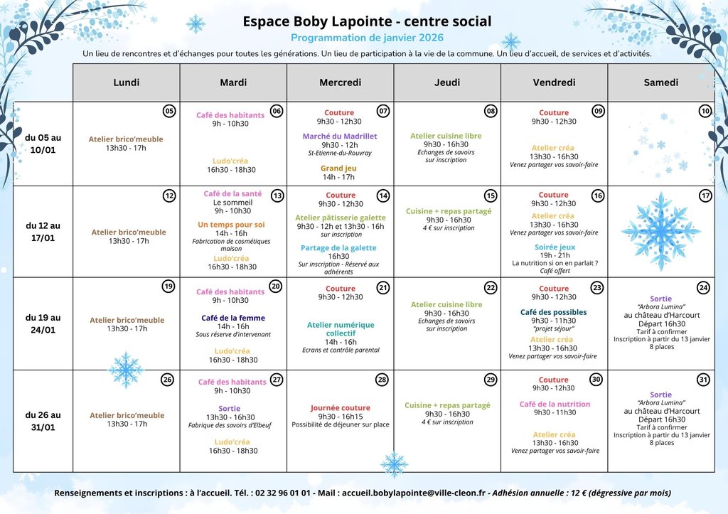 📅 En ce début d’année, les équipes de l’espace Boby Lapointe ont créé une programmation riche et variée. Vous trouverez de quoi passer de bons moments.