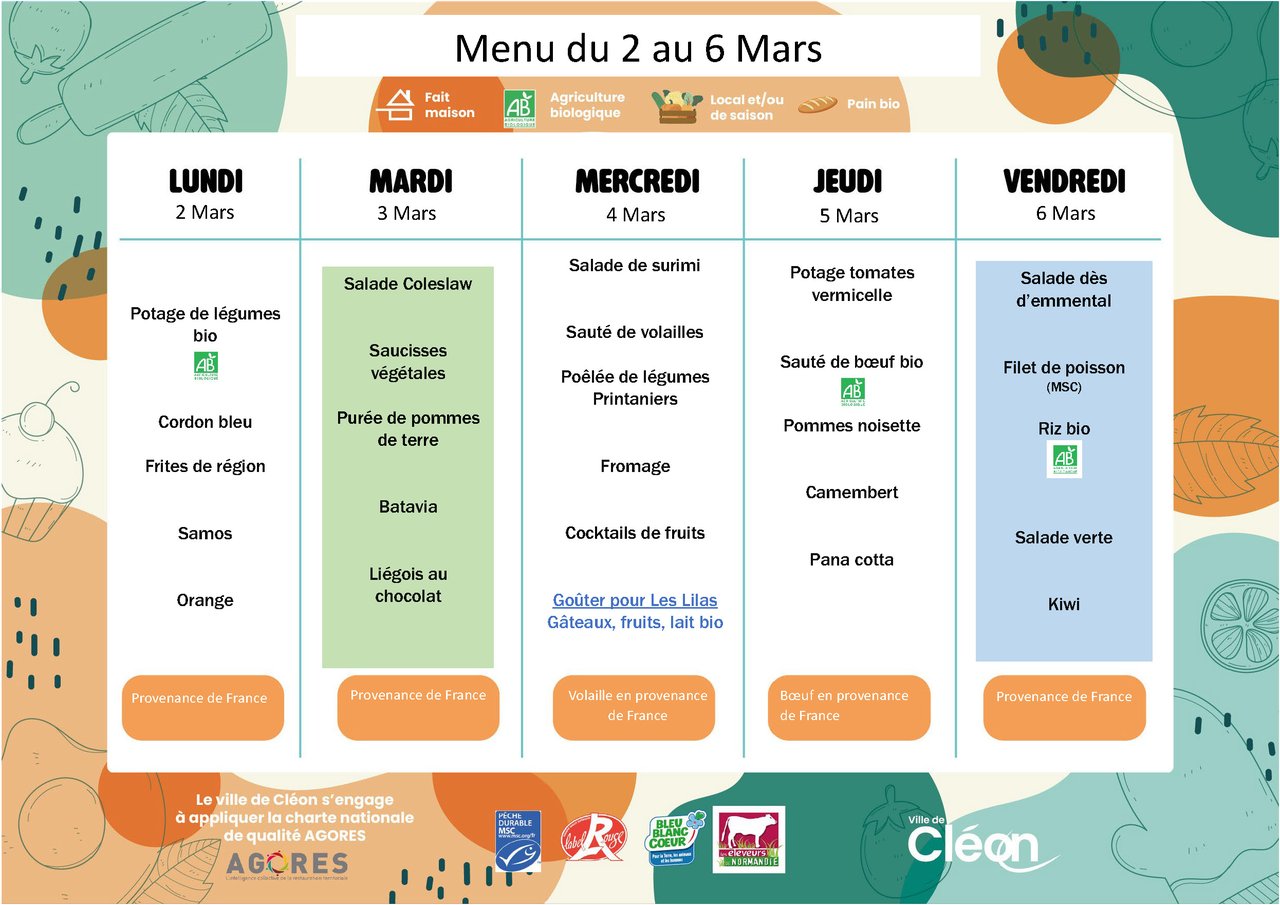 đ„ Retrouvez dĂšs Ă prĂ©sent le menu de la restauration municipale, prĂ©parĂ© par les cuisiniers de lâUnitĂ© Centrale de Production des Repas (UCPR) de la Ville de ClĂ©on, pour la semaine du 2 au 6 mars.