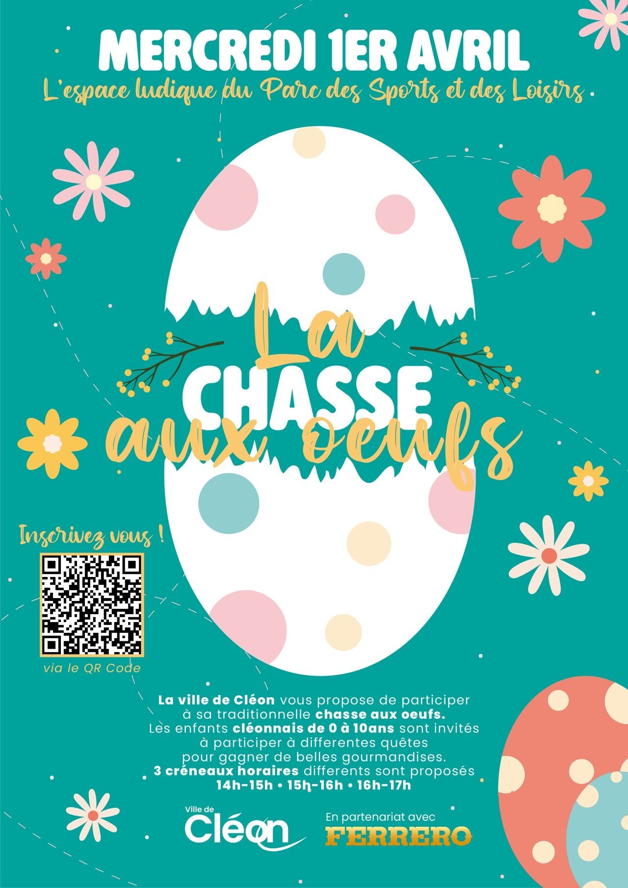 🧺 Pour la quatrième année consécutive, la Ville de Cléon est heureuse d’organiser, en partenariat avec Ferrero, la Chasse aux Œufs mercredi 1er avril, à partir de 14h, dans l’aire ludique à côté du Parc des Sports et des Loisirs.