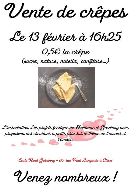 Venez savourer une bonne crêpe à l'école Goscinny ce vendredi 13 février à partir de 16h25 !! Quelles soient nature, au sucre, au chocolat ou à la fraise, elles raviront toutes les papilles et feront un goûter idéal !!