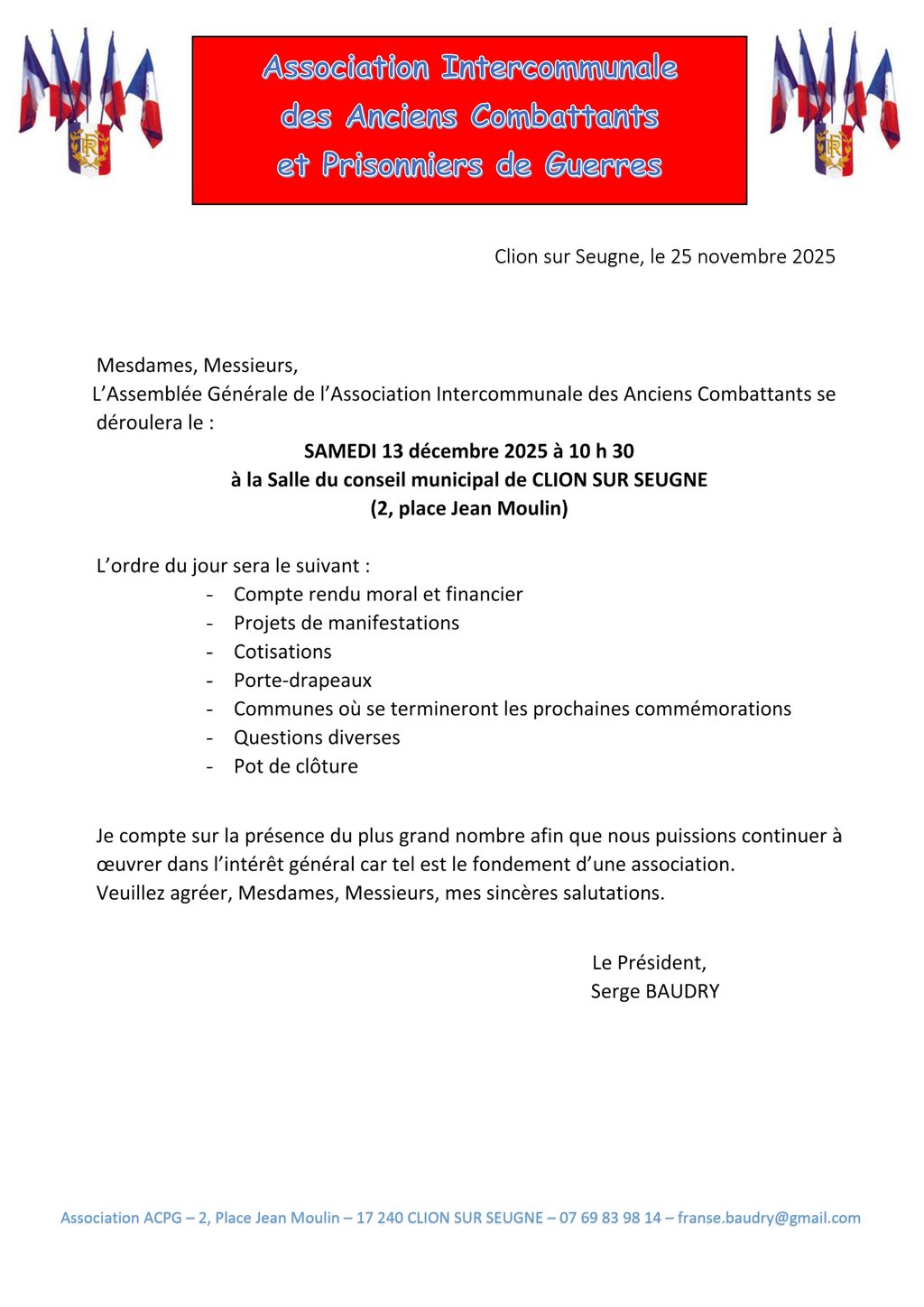 L’Association Intercommunale des Anciens Combattants et Prisonniers de Guerre tiendra son Assemblée Générale le samedi 13 décembre 2025 à 10h30 à la salle du conseil municipal dans les locaux de la Mairie de Clion-sur-Seugne.