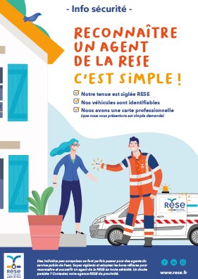 À la veille des fêtes de fin d'année, quelques communes ont signalé des actes de malveillance. Des individus mal intentionnés se présentent au domicile et se font passer pour des salariés de la RESE pour obtenir de l'argent ou repérer des biens. Pour votre sécurité, la RESE vous communique ces 3 indices simples pour reconnaître un véritable salarié de la RESE :
