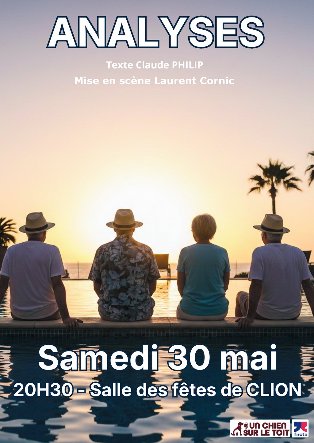 L'association Un Chien sur le Toit vous propose une représentation de la pièce "Analyses" le samedi 30 mai 2026 à 20h30 à la Salle des Fêtes de Clion-sur-Seugne.