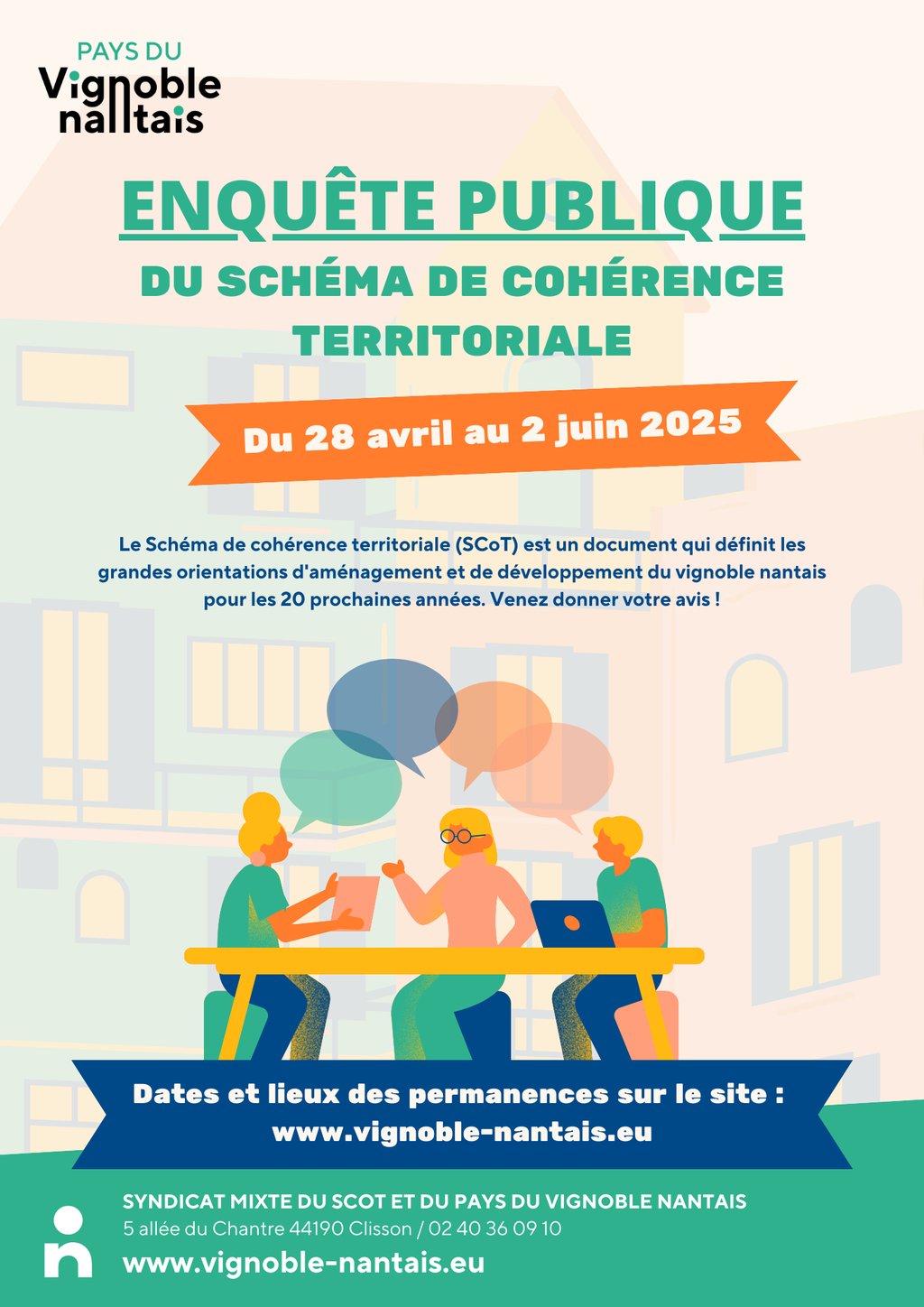 Ce document d’urbanisme concerne les 27 communes des 2 intercommunalités : Communauté de communes Sèvre et Loire, Communauté d’agglomération Clisson Sèvre et Maine Agglo. Le dossier d’enquête publique est composé du projet de SCoT arrêté ainsi que les avis des personnes publiques associées et le bilan de la concertation citoyenne. Le dossier d’enquête publique sera consultable sur le site internet du Pays du Vignoble Nantais et en version papier et numérique dans les lieux de permanences.
