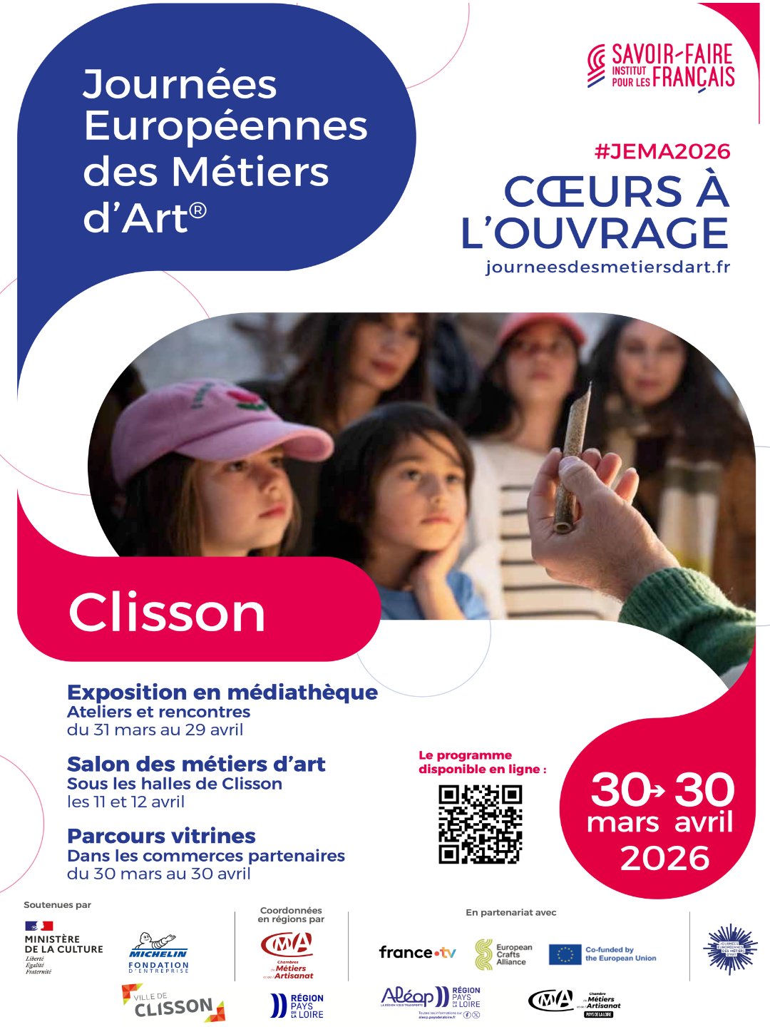 À l’occasion des Journées Européennes des Métiers d’Art (JEMA) – événement porté par l’Institut pour les Savoir-Faire Français – la Ville de Clisson proposera, tout au long du mois d’avril 2026, un programme d’animations ouvertes à tous.