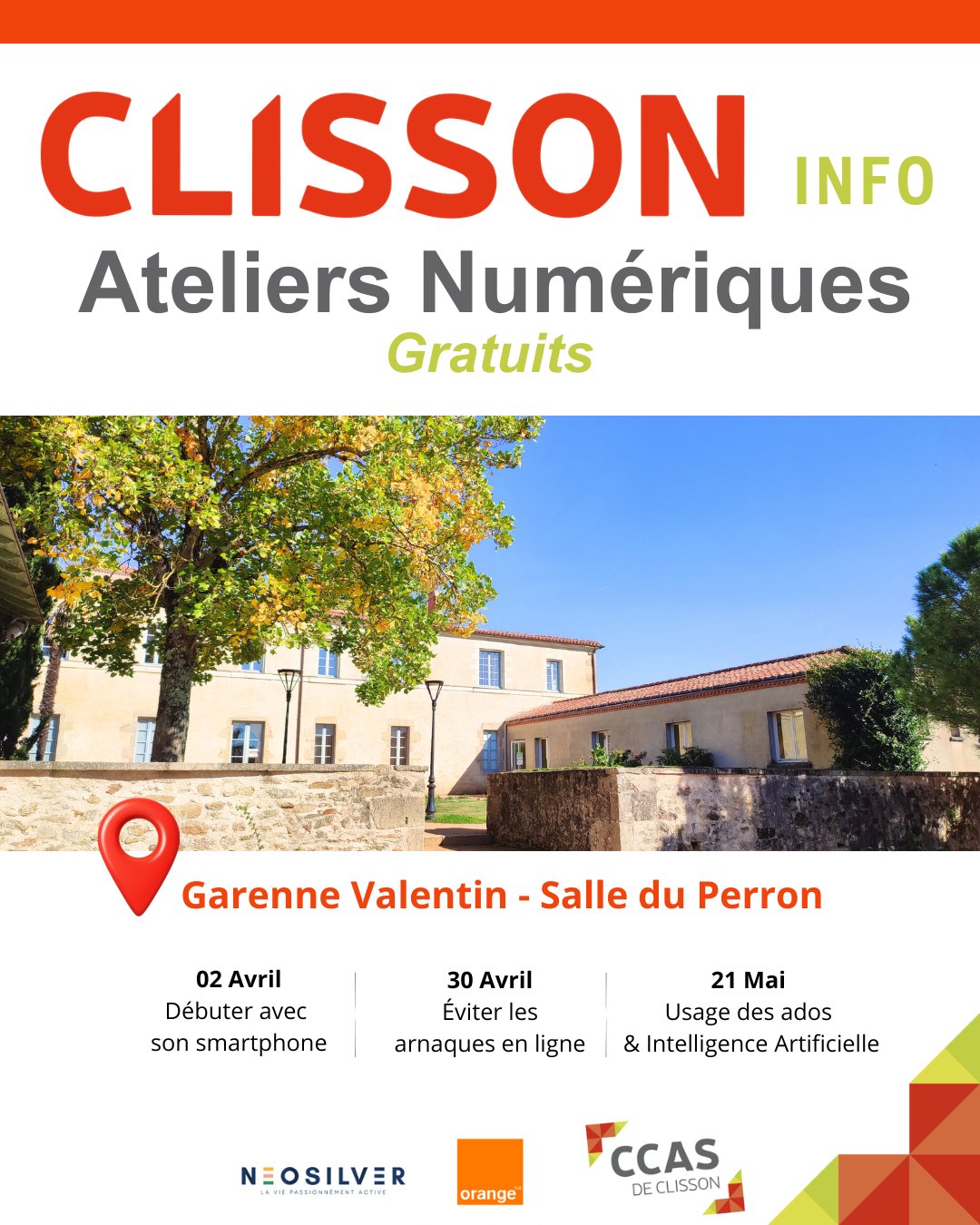 Le CCAS de la Ville de Clisson, en partenariat avec NéoSilver et Orange, vous invite à participer à des ateliers numériques gratuits, adaptés à tous les niveaux, que vous soyez débutant ou expert.