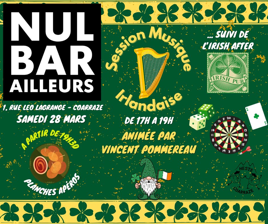 24 ème session de musique Irlandaise et elle aura lieu Samedi 28 Mars de 17h à 19h au Nul Bar Ailleurs.