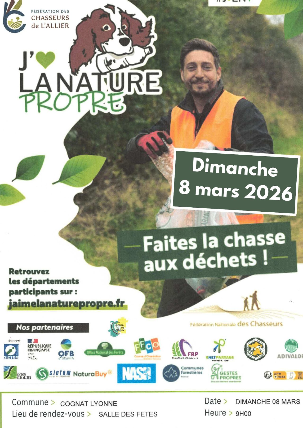 đLa commune de Cognat-Lyonne participe Ă cette action avec la sociĂ©tĂ© de chasse : rendez-vous le dimanche 8 mars Ă 9h00 Ă la salle polyvalente.