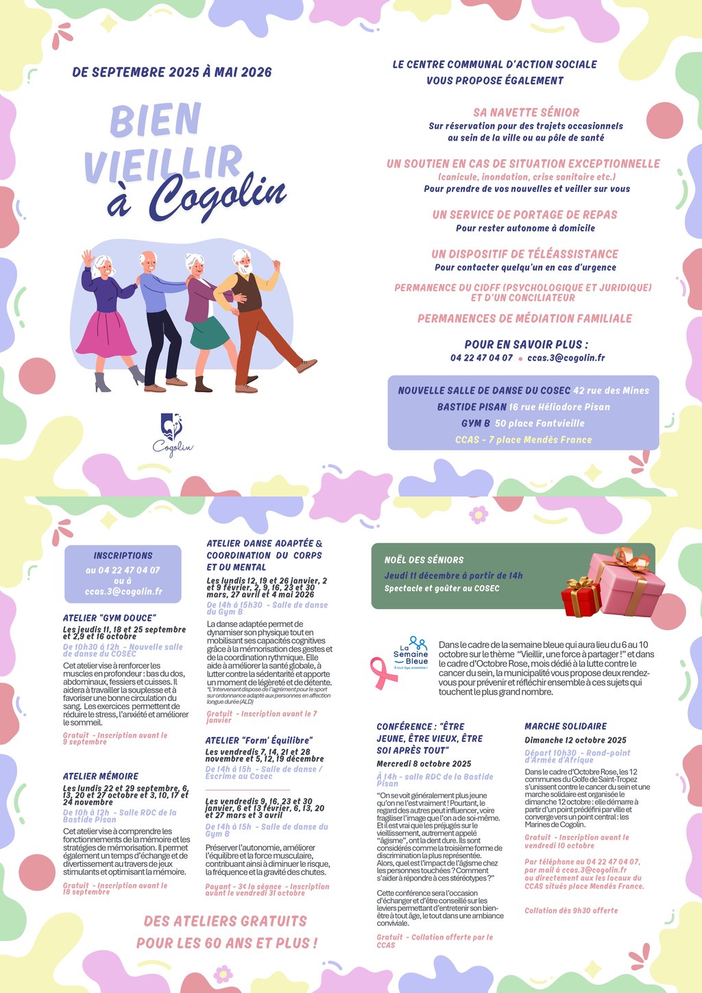 De septembre 2025 à mai 2026, découvrez un programme riche et varié : ateliers mémoire, gym douce, danse adaptée, conférences, actions de prévention santé, ainsi que des temps forts comme la Semaine bleue, Octobre rose ou encore le traditionnel Noël des séniors.