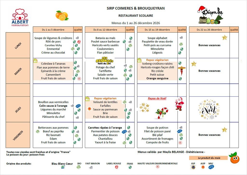Voici le menu de la restauration scolaire du SIRP Brouqueyran - Coimères pour le mois de Décembre.