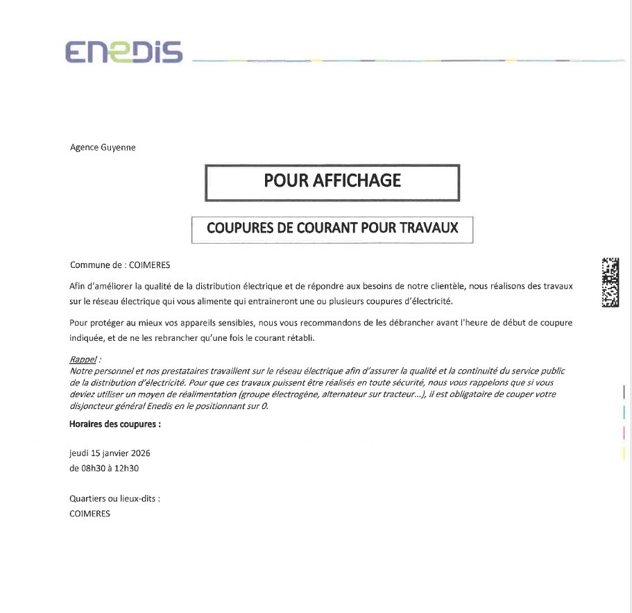 Le jeudi 15 janvier 2026 de 8h30 à 12h30, ENEDIS prévoit une coupure de courant pour travaux.