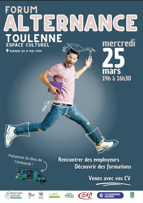 La Mission Locale Sud Gironde, membre du Réseau Pour l’Emploi – France Travail, Cap Emploi - et ses partenaires, Chambre du Commerce et de l’Industrie, Chambre des Métiers et de l’Artisanat, le Pôle Territorial Sud Gironde, ANEFA Gironde et la Commune de Toulenne – organise un événement incontournable pour les jeunes et les adultes en quête d’une formation et d’un emploi :