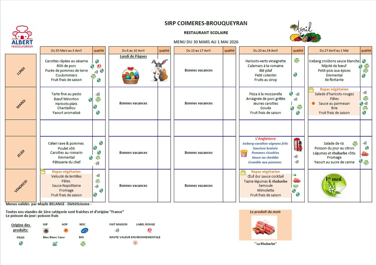 Voici le menu de la restauration scolaire du SIRP Brouqueyran - Coimères pour le mois d'AVRIL 2026.