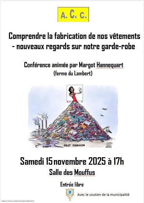 "Comprendre la fabrication de nos vêtements, nouveaux regards sur notre garde-robe" : conférence animée par Margot Hannequart le samedi 15 novembre à 17h à la salle des Mouffus