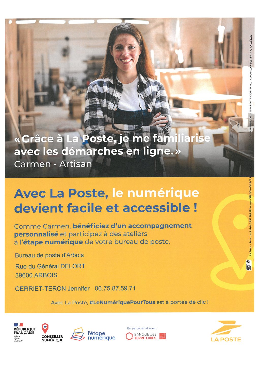 Je me présente, je m’appelle Jennifer GERRIET-TERON, je suis Conseillère Numérique à l’Etape Numérique du bureau de Poste d’Arbois.