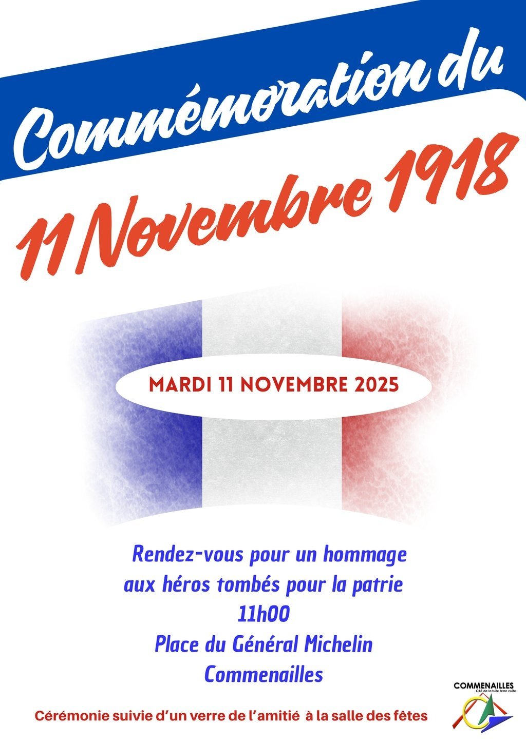 M. le Maire, l'ensemble du conseil municipal et du conseil municipal des jeunes invitent tous les habitants à perpétuer ce devoir de mémoire en se rassemblant sur la place du général Michelin le mardi 11 novembre 2025 à partir de 10 h 45, avec à 11 h le dépôt de gerbe au monument aux morts et la lecture du discours de la ministre des Armées. Les enfants procéderont à la distribution des bleuets de France.