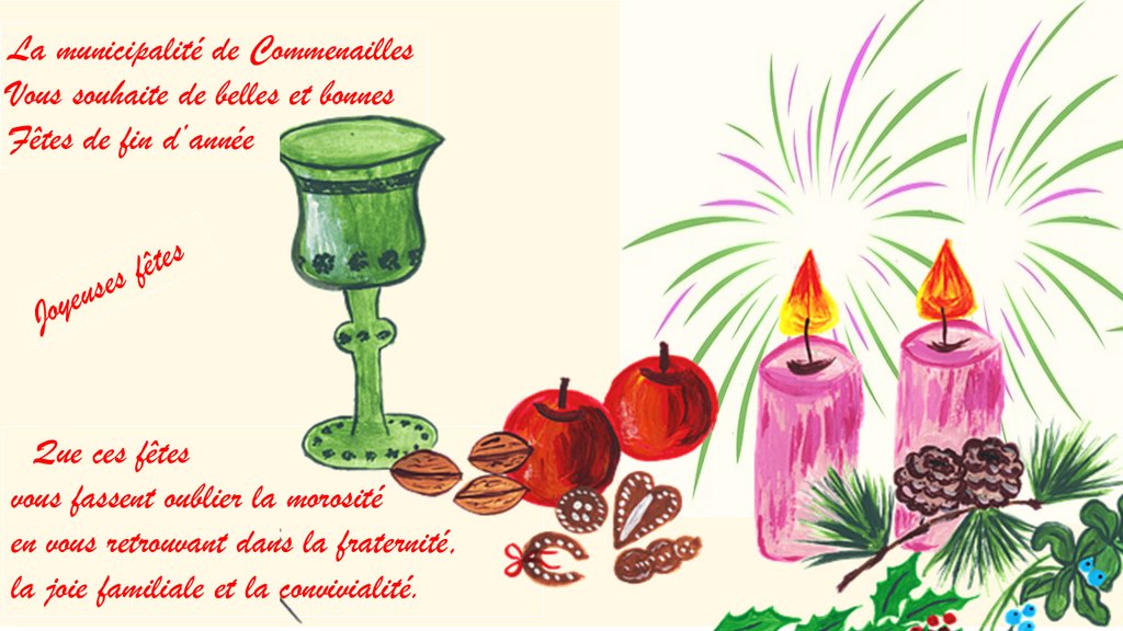 La municipalité de Commenailles, avec le Centre Communal d’Actions Sociales (CCAS) et le Conseil Municipal de Jeunes, vous souhaite à toutes et à tous de joyeuses fêtes. Qu’elles soient faites d’amour et d’amitié, de fraternité et de partage, de joie et de convivialité. Profitez bien de ce temps en famille et du plaisir d’être ensemble.