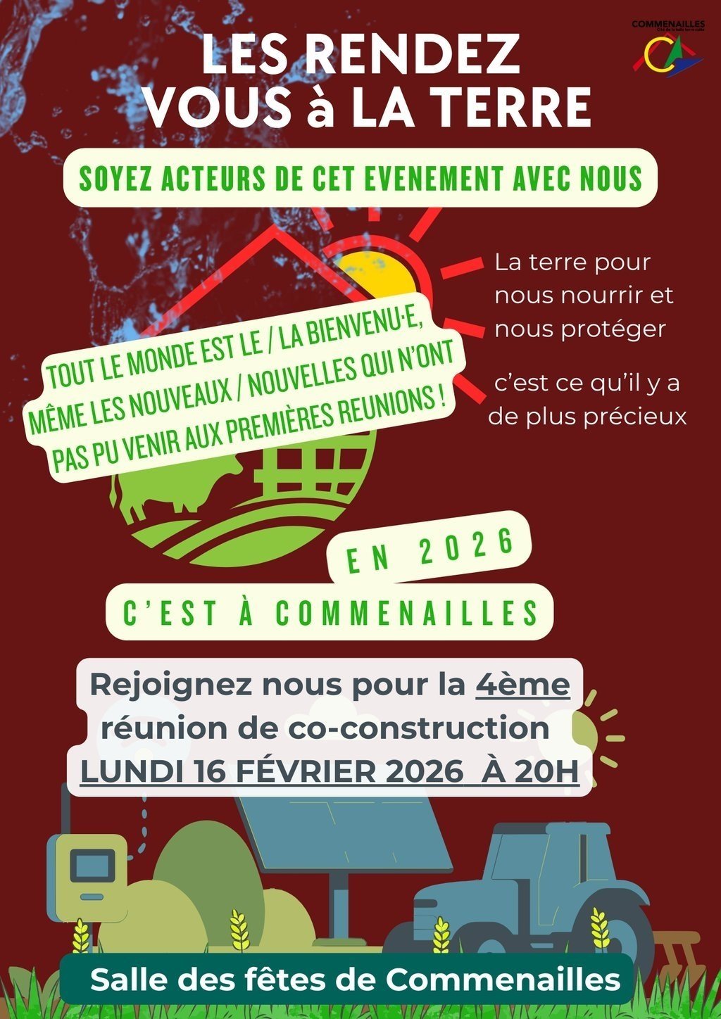 Que vous ayez participé(e) ou non aux précédentes réunions, vous êtes invité ce lundi 16 février à 20H à la salle des fêtes pour la 4ème réunion de co-construction des RDV à la terre qui se dérouleront dans notre village en 2026.