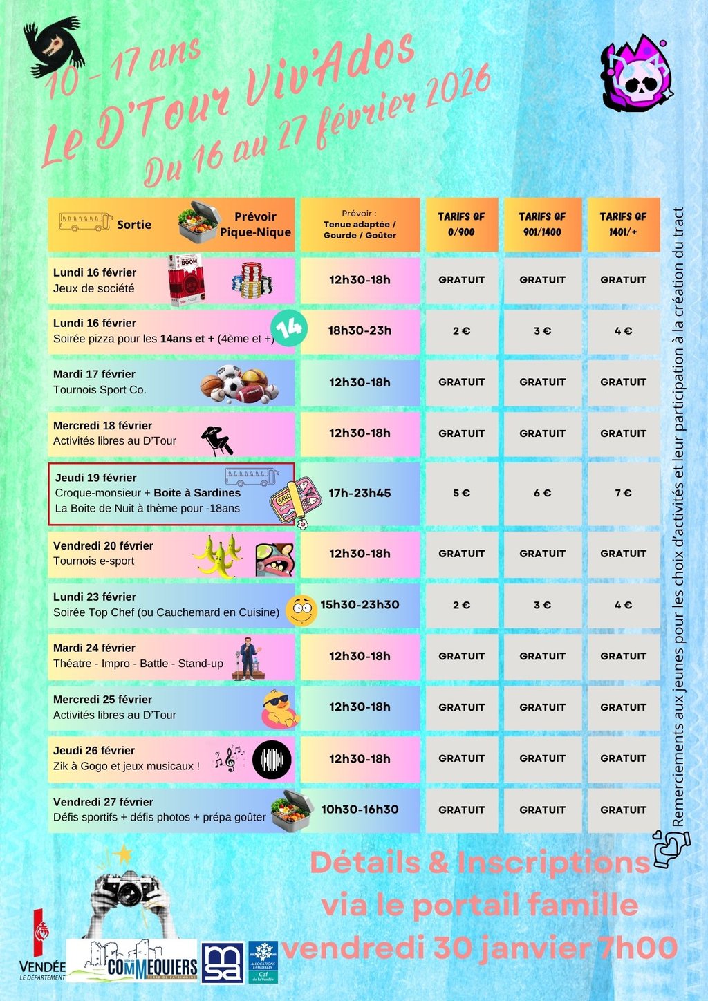 Voici le programme des vacances de février pour le D'Tour / Viv'Ados de Commequiers