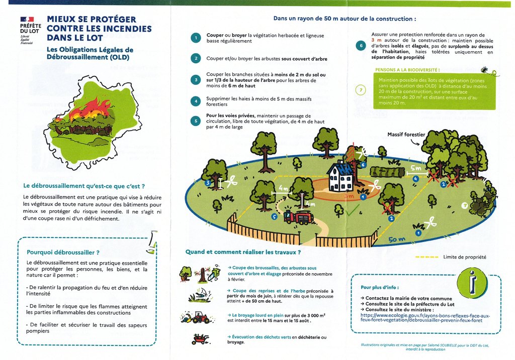 Dans le Lot, l'obligation légale de débroussaillement (OLD) s'applique à toute habitation située à moins de 200 mètres d’un bois ou d’une forêt classée à risque. Elle impose aux propriétaires de débroussailler sur un périmètre de 50 mètres autour des constructions et 10 mètres de part et d’autre des voies d’accès.