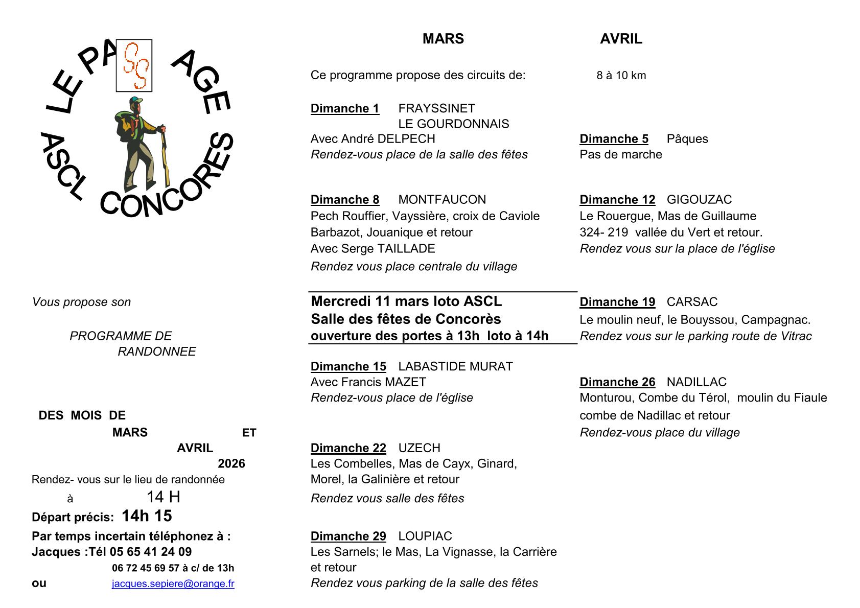 ASCL - PROGRAMME DES MARCHES MARS & AVRIL 2026