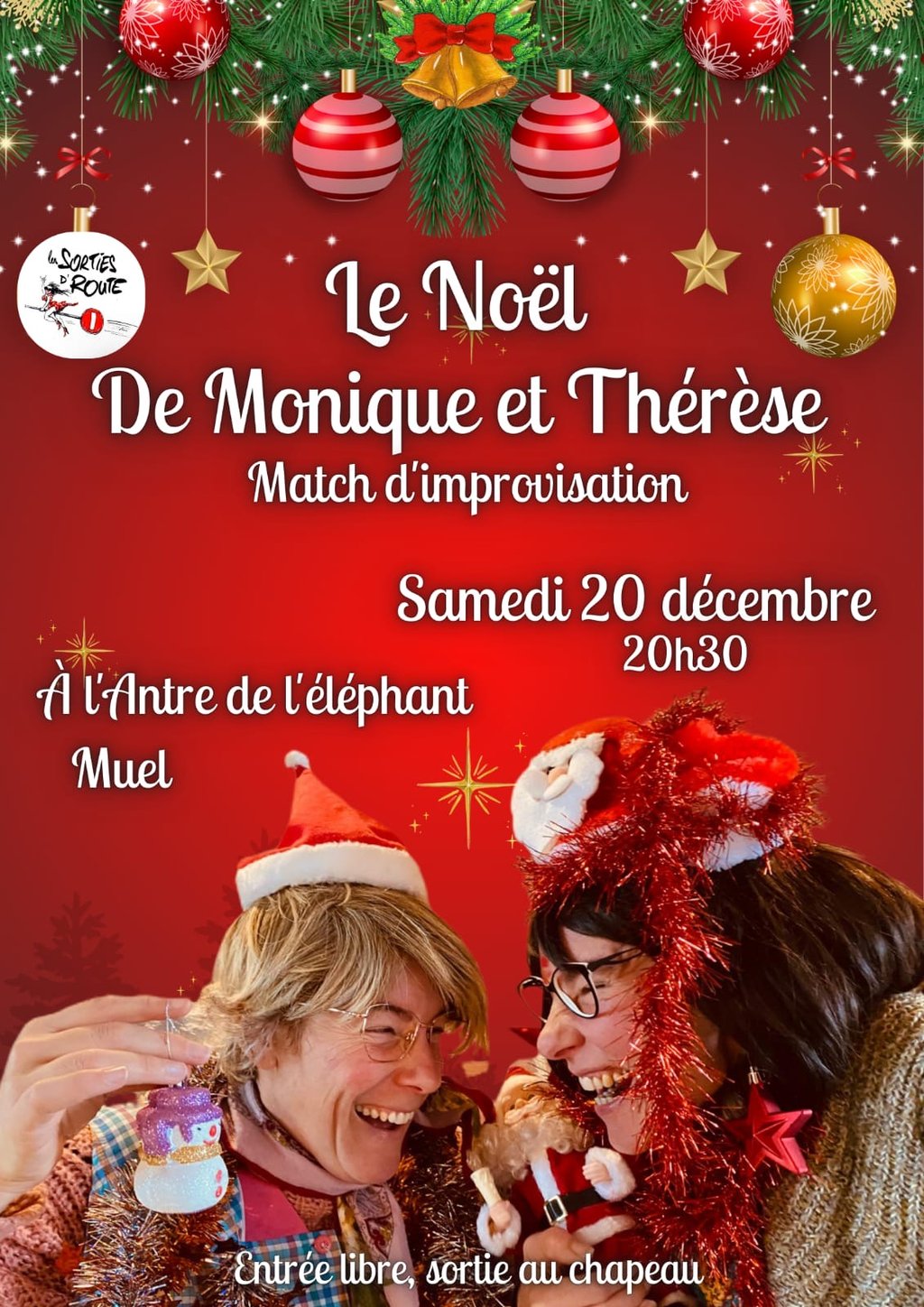 Préparez-vous pour des histoires incroyables, des cascades sans doublage et des répliques qui tombent à pic. 6 joueurs ambianceront la scène de l’Antre pour votre plus grand plaisir. Et Monique et Thérèse animeront la soirée dans une ambiance de Noël particulièrement déjantée !