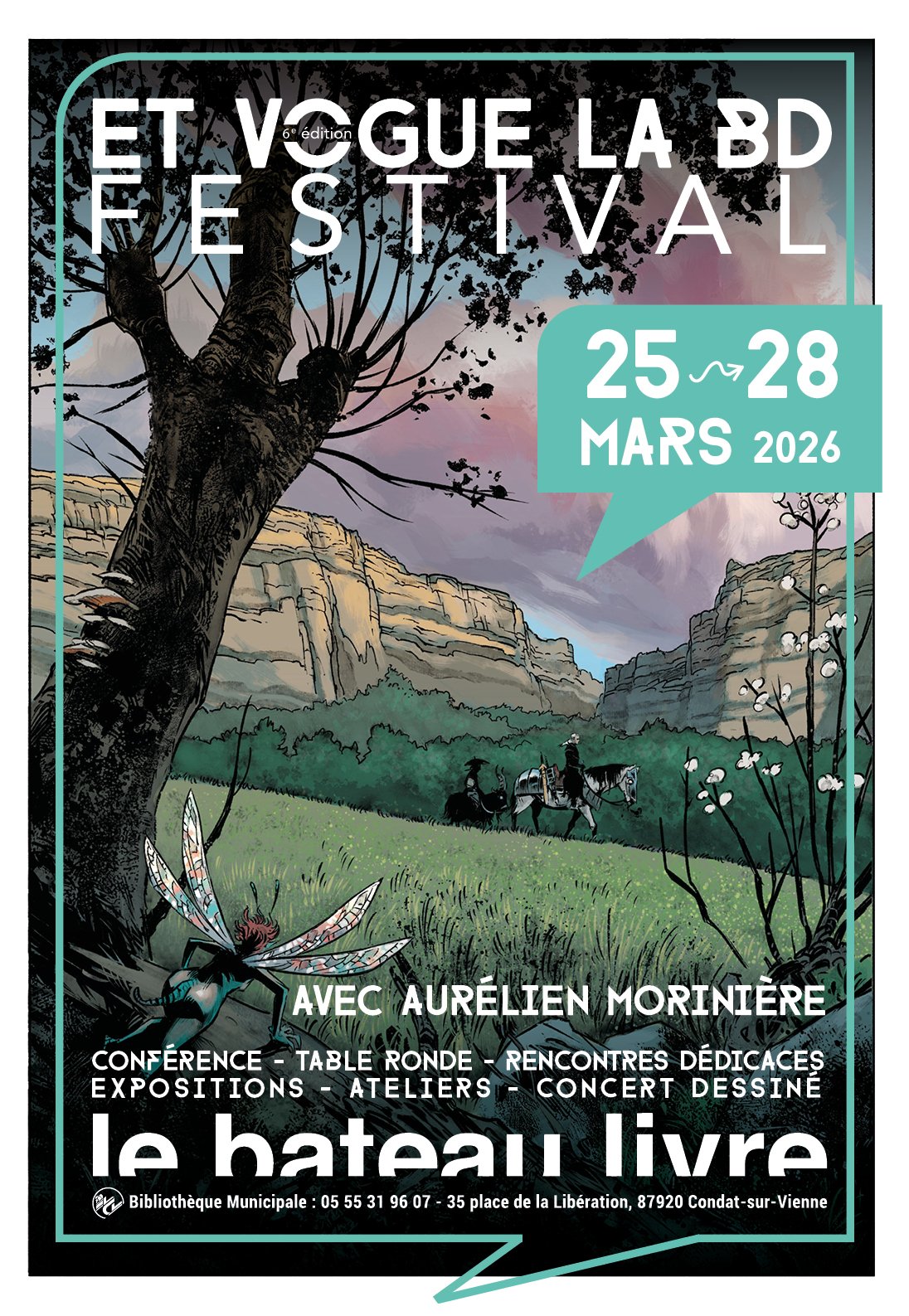 Du 25 au 28 mars 2026, le festival “Et Vogue la BD” revient à Condat-sur-Vienne pour trois jours intenses consacrés au 9eme art. Cette nouvelle édition explore un thème fort : le passage du réel à l’imaginaire. Car la bande dessinée ne se contente pas de divertir, elle raconte l’Histoire, questionne notre époque et invente d’autres mondes. Conférences, table ronde, ateliers créatifs, rencontres dédicaces, concert dessiné et expositions : le programme s’adresse à tous les publics, des passionnés aux curieux, des enfants aux lecteurs avertis !
