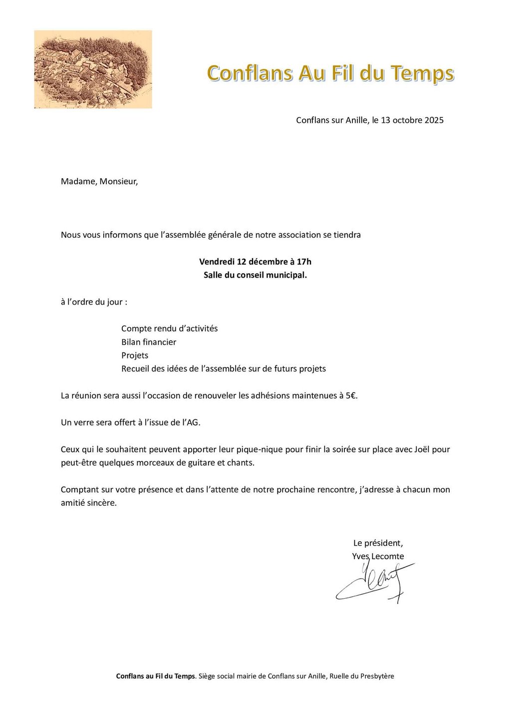 L'association Conflans Au Fil du Temps organise son Assemblée générale le vendredi 12 décembre - Salle du conseil municipal