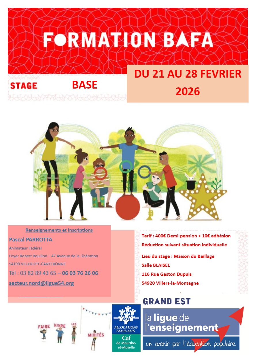 La Ligue de l'Enseignement du Grand Est et la CAF de Meurthe-et-Moselle organise un stage de base formation du 21 au 28 février 2026 à VILLERS LA MONTAGNE.