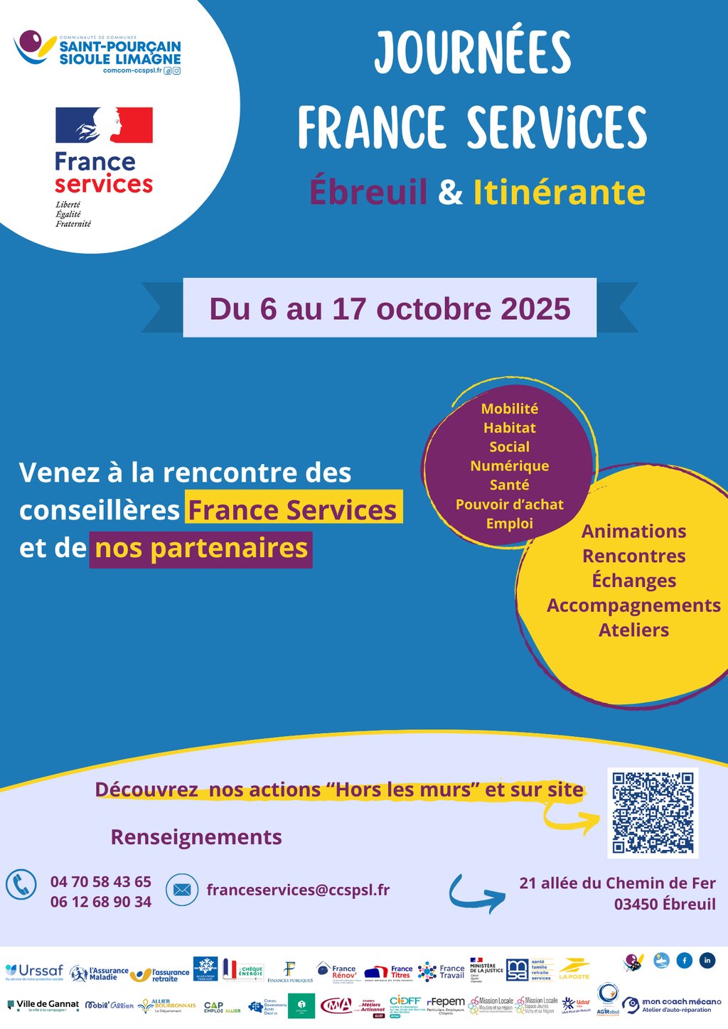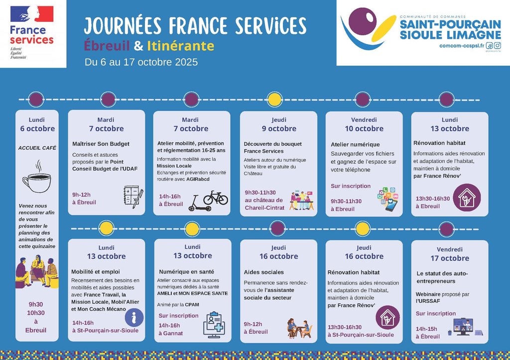 Animations, rencontres, ateliers et échanges sont au programme des Journées France Services. Vous souhaitez en savoir plus sur les solutions de mobilité pour faciliter vos démarches professionnelles ? Besoin d’aide pour mieux utiliser les outils numériques, notamment en santé ? Vous envisagez de rénover votre logement et avez des questions sur les aides possibles ? Venez à la rencontre des conseillères France Services d’Ébreuil et de leurs partenaires durant la première quinzaine d’octobre, pour découvrir leurs actions sur site et « hors les murs ».