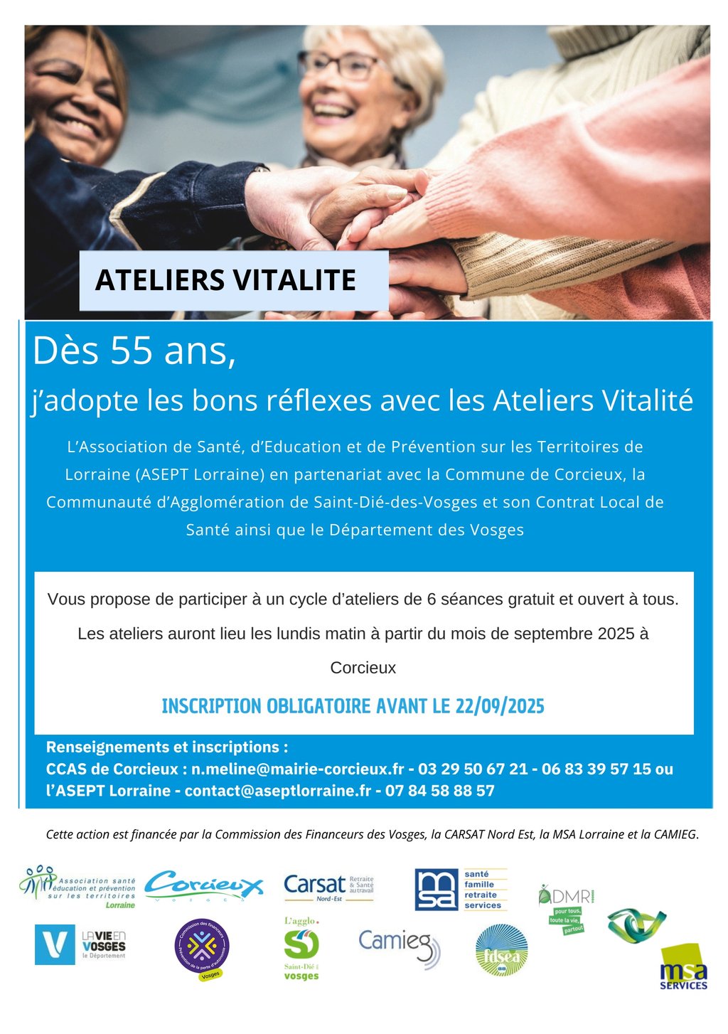 L'ASEPT Lorraine (Association de Santé, d'Éducation et de Prévention sur les Territoires de Lorraine, en partenariat avec la Commune de Corcieux, l'Agglomération de Agglo Saint-Dié et le Département Je Vois la Vie en Vosges ; propose aux + de 55 ans un cycle de 6 ateliers pour les aider à bien vieillir (dans la tête et dans le corps) !
