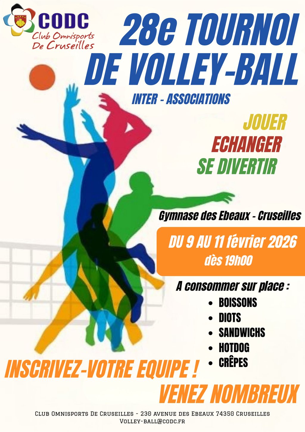 Le Club Omnisports de Cruseilles organise du lundi 9 février au mercredi 11 février 2026 son traditionnel tournoi de volley-ball inter-associations, groupe d’amis et entreprises.