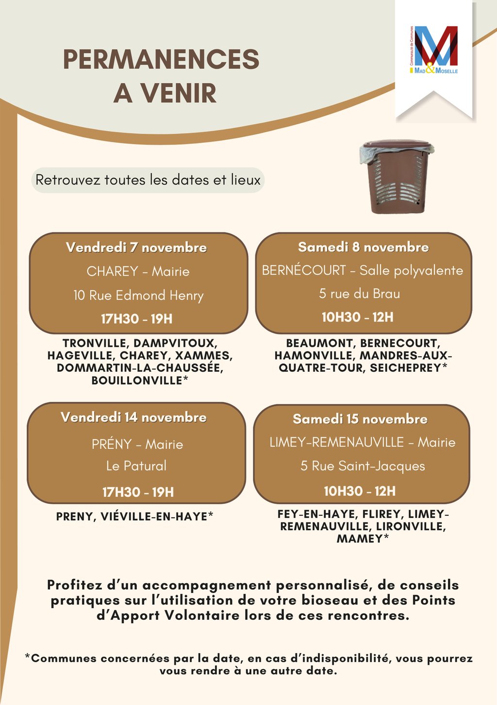 🪣Venez récupérer votre bioseau lors des permanences organisées par la Communauté de Communes pour tout savoir sur cette nouvelle collecte ! Des séances de moins de 15 minutes sont prévues tout au long des permanences pour éviter l’attente.