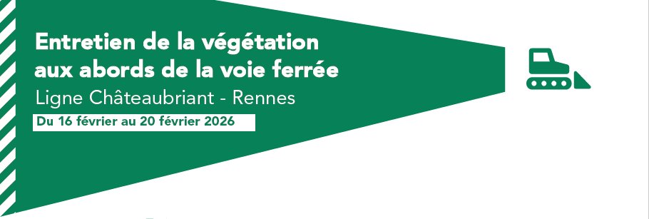 SNCF Réseau réalise des travaux d’entretien de la végétation sur la ligne de Châteaubriant à Rennes. Le chantier se situera sur les communes de Brie, Corps-Nuds, Saint-Armel, Vern-sur-Seiche. Ils se dérouleront de nuit en semaine du lundi 16 février au vendredi 20 février 2026 (du lundi soir au vendredi matin).