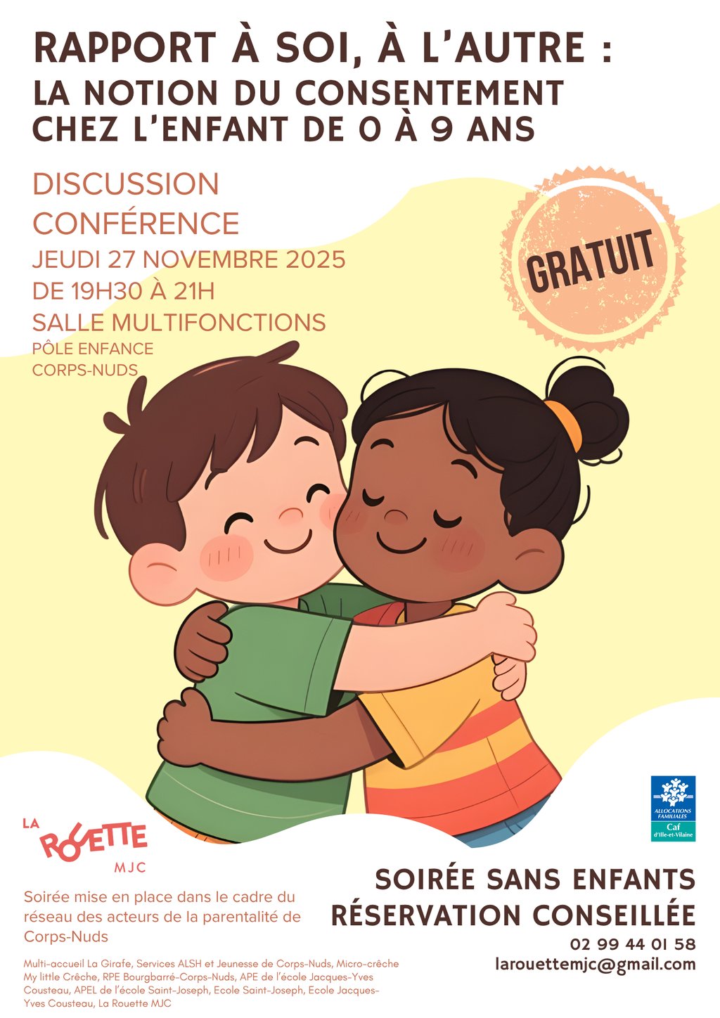 Conférence mise en place par le réseau des acteurs de la parentalité de Corps-Nuds, comprenant les services Jeunesse et ALSH de Corps-Nuds, la micro-crèche My Little Crèche, le Multi-accueil La Girafe, l'école privée Saint-Joseph, l'école publique Jacques-Yves Cousteau, l'APEL de l'école Saint-Joseph, l'APE de l'école Jacques-Yves Cousteau, le RPE Bourgbarré-Corps-Nuds, La Rouette MJC