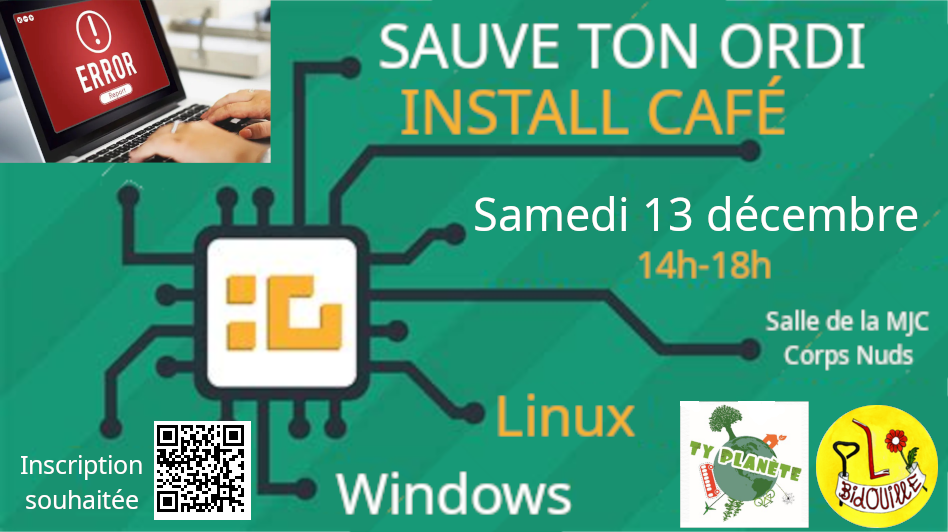 L'association Bidouille et le collectif Ty Planète proposent un «Install café» : un atelier accessible aux débutant⋅es visant à prolonger la vie des ordinateurs refusant la mise à jour vers Windows 11. Différentes options seront proposées, parmi elles, l'installation de Linux.