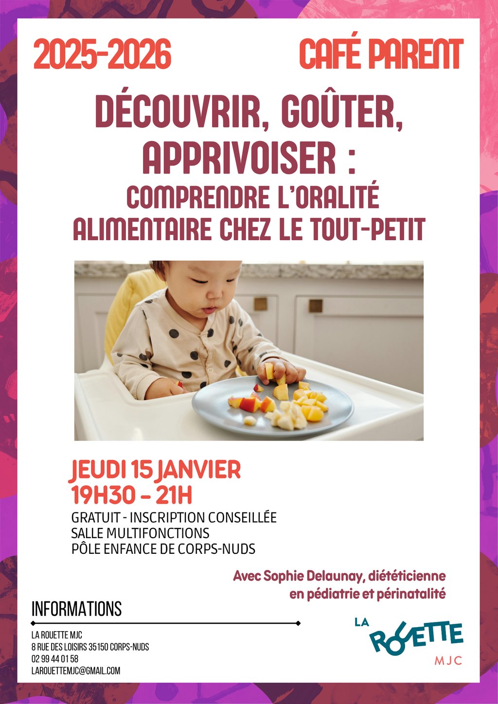 La MJC a le plaisir de vous inviter au prochain café parent qui traitera de l'oralité alimentaire chez le tout-petit. Ce moment de partage et d'échange sera l'occasion d'aborder ce qu'est l'oralité alimentaire, les grandes étapes de son développement, et de donner des petites astuces du quotidien pour accompagner la découverte alimentaire, sans pression et en toute simplicité !
