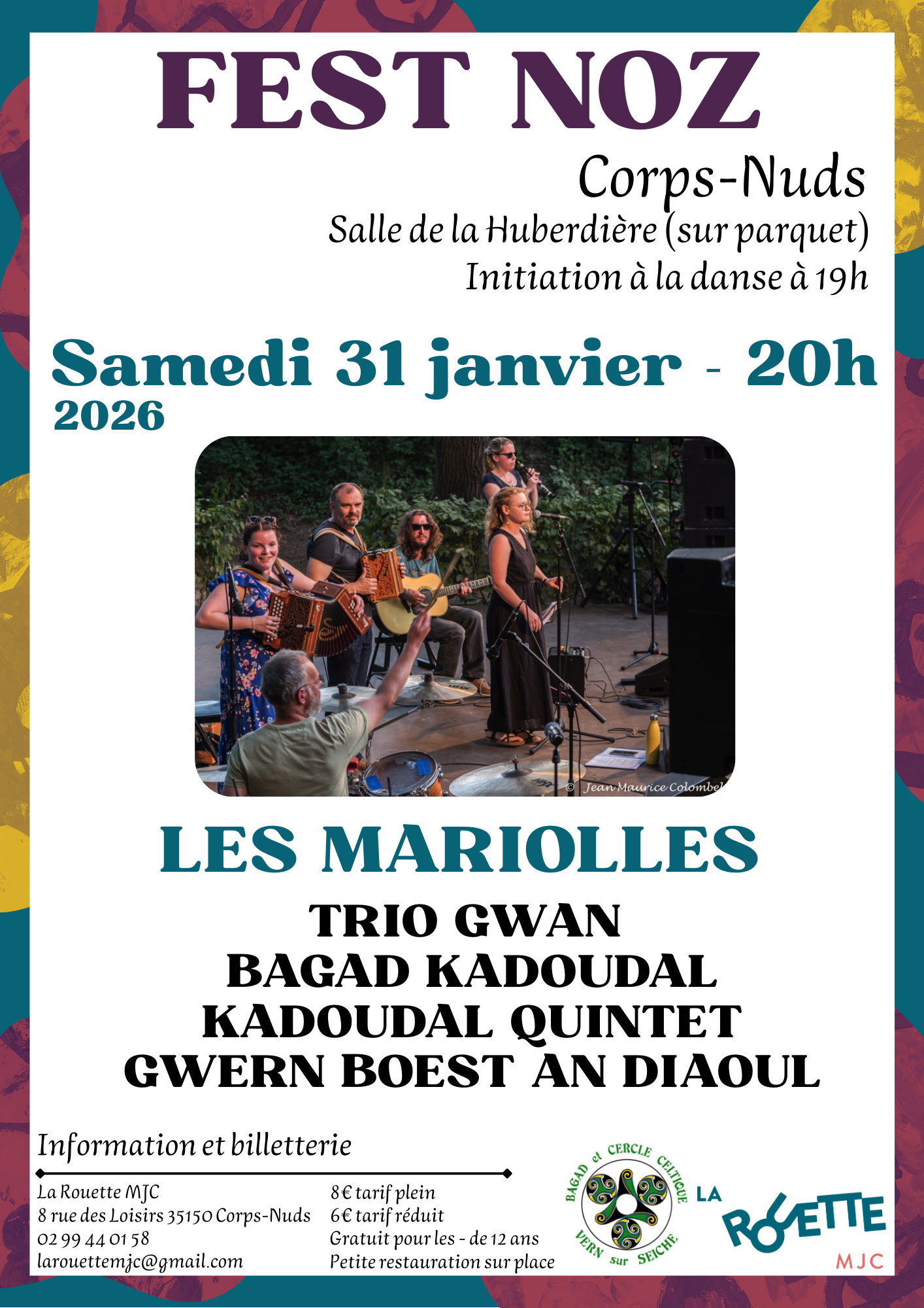 La Rouette MJC et le Bagad Kadoudal organisent leur Fest-Noz annuel le samedi 31 janvier 2026 à partir de 20h, à la salle de la Huberdière de Corps Nuds. Ouvert à toutes et tous, l’événement s’adresse aussi bien aux danseurs et danseuses confirmé·es qu’aux personnes souhaitant découvrir les danses traditionnelles bretonnes.