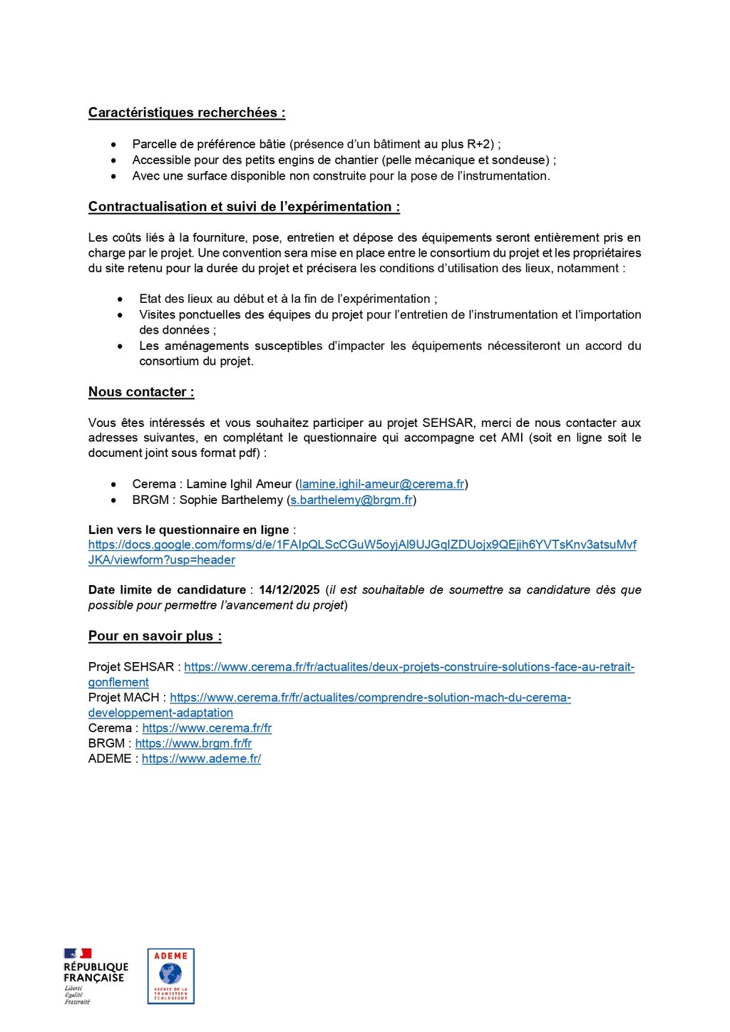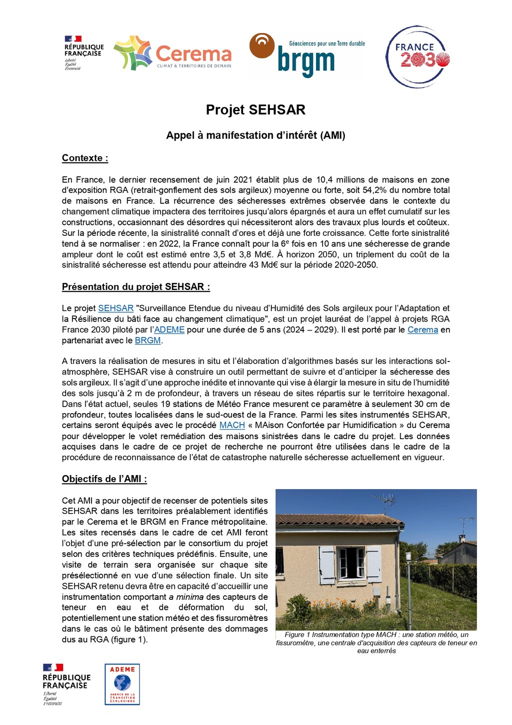 Cet Appel à Manifestation d'Intérêt (AMI) a pour objectif de recenser de potentiels sites SEHSAR (Surveillance Étendue du niveau d’Humidité des Sols argileux pour l’Adaptation et la Résilience du bâti face au changement climatique) dans les territoires préalablement identifiés par le Cerema et le BRGM en France métropolitaine.