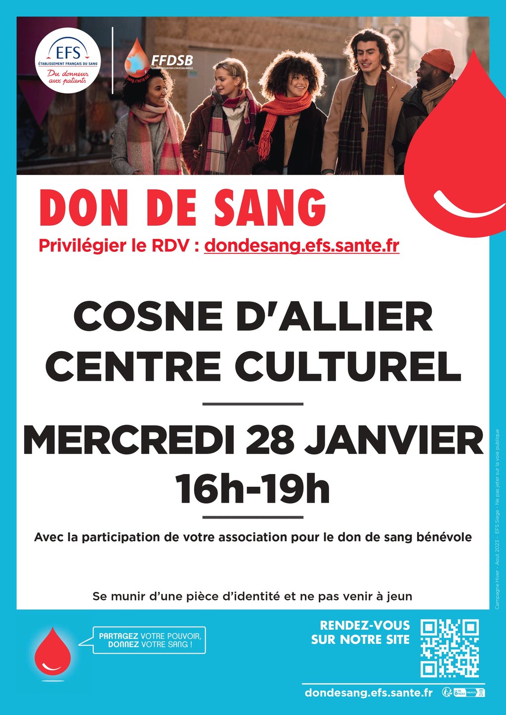 Collecte de sang de 16h00 Ă 19h00 au centre culturel sur inscription. đđ