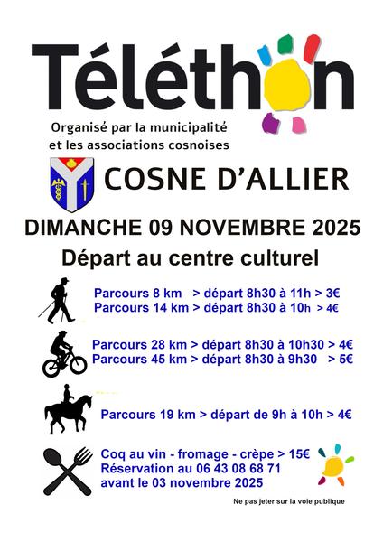 La municipalité et les associations Cosnoises organisent une manifestation au profit du Téléthon le dimanche 09 novembre 2025, à partir de 8h30.