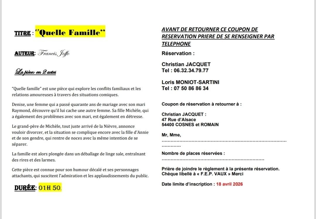 La pièce, qui sera interprétée par la troupe MIRABELLE de AUBANGE, s'intitule “QUELLE FAMILLE !”