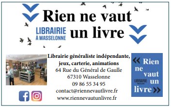 Afin de soutenir le commerce local, à Wasselonne, nous vous rappelons que nous avons la chance d’avoir une librairie « Rien ne vaut un livre » qui offre un large choix de livres dans des domaines divers et variés.