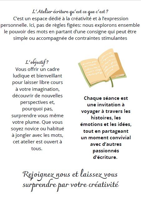 Vous offrir un cadre ludique et bienveillant pour laisser libre cours à votre imagination, découvrir de nouvelles perspectives et, pourquoi pas, surprendre vous-même votre plume. Que vous soyez novice ou habitué à jongler avec les mots, cet atelier est ouvert à tous.