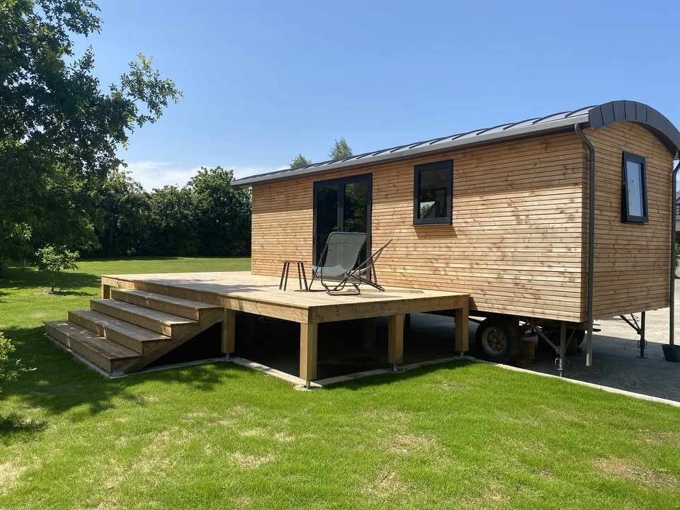 Vous aurez accès directement à la roulotte ainsi qu'à sa terrasse privative et son coin de pelouse avec vue sur la campagne.