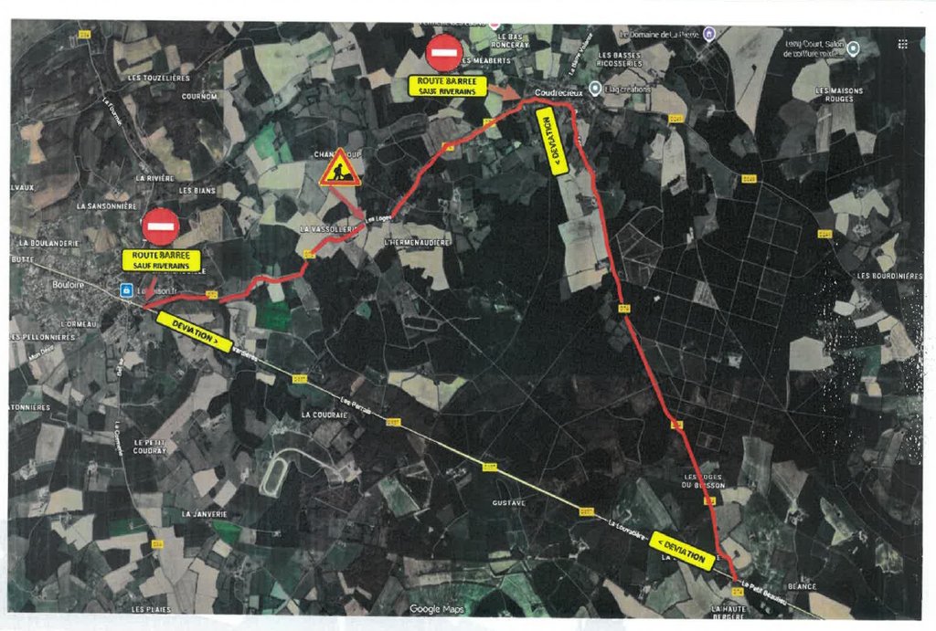Pendant l’exécution des travaux d’aménagement de la traversée des Loges, la route départementale n°72 au niveau du hameau des Loges de la commune de Coudrecieux est fermée à la circulation. Le stationnement y est interdit.