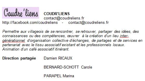 Coudre’liens est une jeune association de Coudrecieux fondée en mars 2016, déclarée en préfecture du Mans avec pour but de créer un lieu d’échanges intergénérationnel, de renforcer et créer de nouveaux liens.