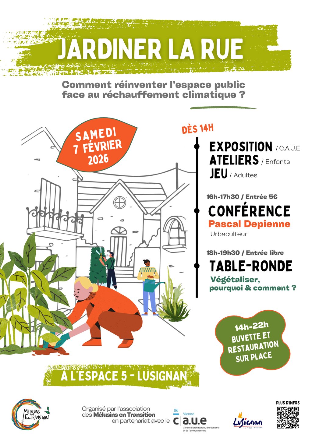L'association des Mélusins en transition organise le samedi 7 février 2026 à l'espace V de Lusignan à 14H00 une après-midi sur le thème de la végétalisation des bourgs intitulée Jardiner la rue.